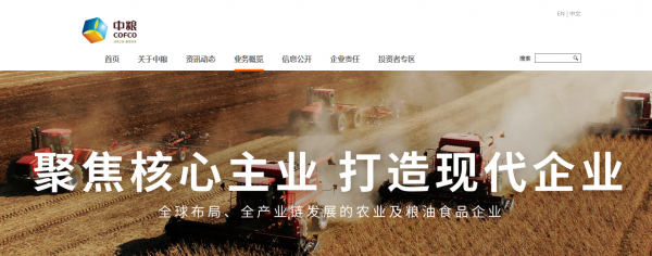 中*集團(tuán)有限公司(COFCO)是立足中國的國際一流糧食企業(yè),是全球布局、全產(chǎn)業(yè)鏈、擁有最大市場和發(fā)展?jié)摿Φ霓r(nóng)業(yè)及糧油食品企業(yè),集貿(mào)易、加工、銷售、研發(fā)于一體的投資控股公司。中糧集團(tuán)以“確保國家糧食安全,把中國人的飯碗牢牢端在自己手中”為己任,致力于打造具有全球競爭力的世界一流糧食企業(yè),構(gòu)建具有中糧特色的國有資本投資公司。