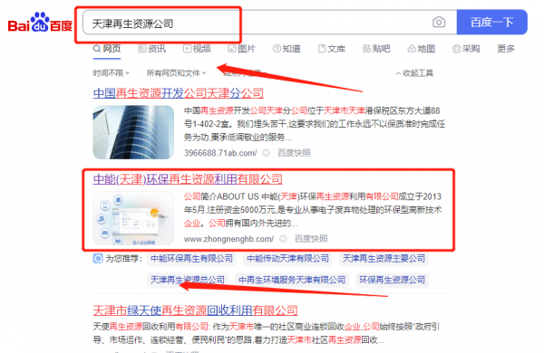 中*(天津)環保再生資源利用有限公司網站排名最快上詞效果展示