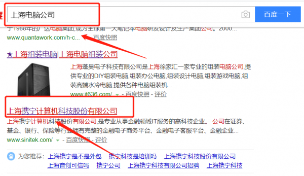 我們公司與上海攜寧計算機科技股份有限公司合作中,對這個公司所經營的電腦這個行業提供了快速排名,與該公司的合作,更多的客戶讓我們公司為其提供快速排名,通過每一次合作,我們公司不斷完善自己,同時希望合作伙伴在經營的路上越來越好。