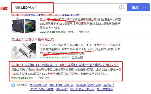昆山*澄光電科技有限公司選用我司企業LED屏的網站優化產品,其SEO關鍵詞有LED屏。搜索品牌詞,首頁至少霸占5條,通過營銷型網站、媒體文章、口碑等方式,達到全方位霸屏,全面展示企業實力。昆山*澄光電科技有限公司成立于2009年,是經昆山市市場監督管理局審核的有資質的公司,其統一社會信用代碼:913205836**767128B。公司地址:江蘇省昆山市巴城鎮前進西路3260號。