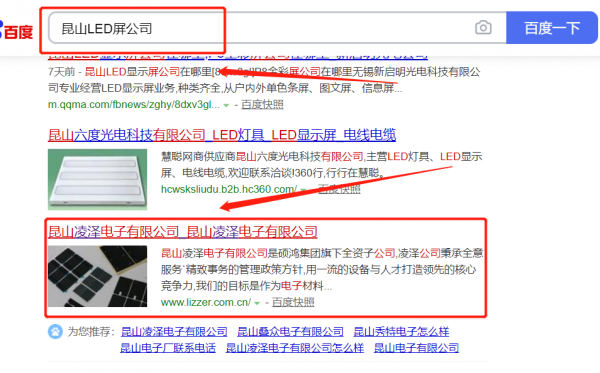 昆山*澤電子有限公司選用我司企業LED屏的網站優化產品,其SEO關鍵詞有LED屏。搜索品牌詞,首頁至少霸占5條,通過營銷型網站、媒體文章、口碑等方式,達到全方位霸屏,全面展示企業實力。昆山*澤電子有限公司成立于2012年,是經昆山市市場監督管理局審核的有資質的公司,其統一社會信用代碼:91320583**3940531P。公司地址:江蘇省昆山市玉山鎮環慶路2588號原創企業基地工業區6號6號房。