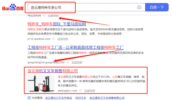 我們公司與連云港杭*叉車銷售有限公司合作中,對這個公司所經營的特種車類這個行業(yè)提供了網站SEO優(yōu)化,與該公司的合作,更多的客戶讓我們公司為其提供百度快照排名,通過每一次合作,我們公司不斷完善自己,同時希望合作伙伴在經營的路上越來越好。