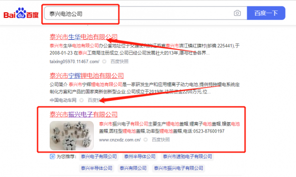 泰興市振*電子有限公司選用我司企業(yè)電池的網(wǎng)站優(yōu)化產(chǎn)品,其SEO關(guān)鍵詞有電池。搜索品牌詞,首頁(yè)至少霸占5條,通過(guò)營(yíng)銷(xiāo)型網(wǎng)站、媒體文章、口碑等方式,達(dá)到全方位霸屏,全面展示企業(yè)實(shí)力。泰興市振*電子有限公司成立于1987年,是經(jīng)泰興市市場(chǎng)監(jiān)督管理局審核的有資質(zhì)的公司,其統(tǒng)一社會(huì)信用代碼:913212837**41093XD。公司地址:江蘇省泰興市黨校路33-8號(hào)。