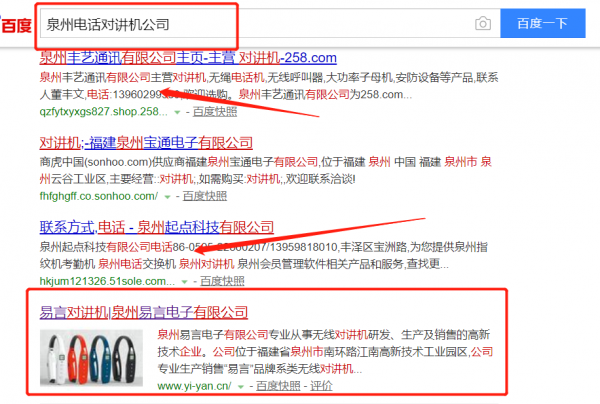 我們公司與泉州易言電子有限公司合作中,對這個公司所經營的電話對講機這個行業提供了關鍵詞搜索排名,與該公司的合作,更多的客戶讓我們公司為其提供關鍵詞搜索排名,通過每一次合作,我們公司不斷完善自己,同時希望合作伙伴在經營的路上越來越好。