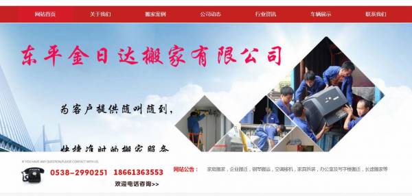 東平金*達搬家有限公司選用我司企業跑腿行業的網站優化產品,其SEO關鍵詞有 東平搬家,東平搬家公司,東平家庭搬家,東平企業搬遷,東平板式家具拆裝,東平長途搬運,東平大型公司搬遷,東平空調移機,東平鋼琴搬運,東平搬家公司電話,東平奇石搬運,東平家具拆裝,東平太陽能移機,東平熱水器移機,東平清洗油煙機,東平金*達搬家有限公司。其特點是用很合適的展示方式、展示效果、站點框架,把客戶及其用戶很關心的問題突出表現;并以簡潔明朗的設計風格,清晰展現公司水平實力,確保一秒抓住目標用戶眼球,給用戶留下良好的第一印象。東平金*達搬家有限公司成立于1996年,是經東平市市場監督管理局審核的有資質的公司,其統一社會信用代碼:91370923**6648181K。公司地址:東平縣平湖路與汶河街交匯處。